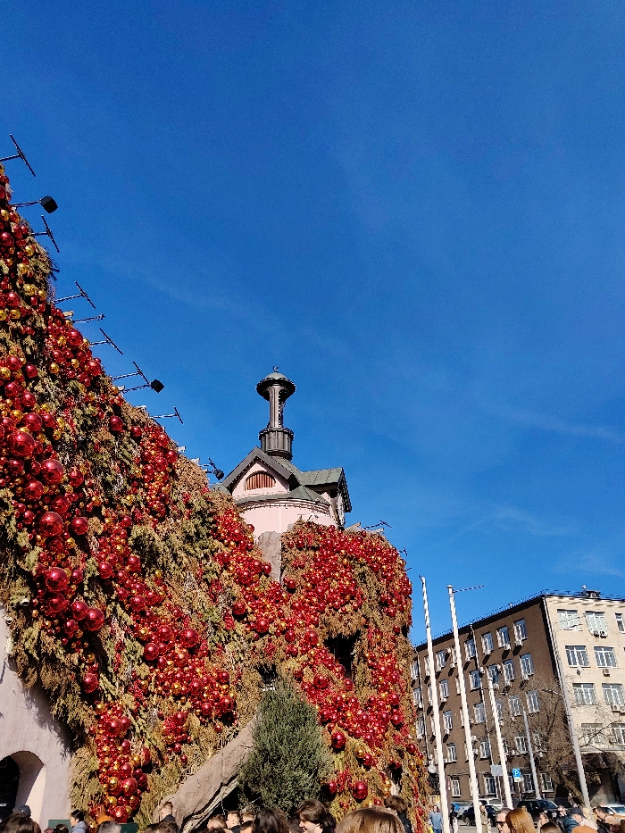 The image depicts the heavily decorated facade of the Central Department Store (TsUM) located on Petrovka Street in Moscow, Russia, under a clear blue sky. The multi-story building, characterized by a light pink/beige base and a prominent, dark-capped cupola or turret, is almost entirely covered with dense artificial foliage, primarily green and brown, densely adorned with numerous glossy red and scattered gold spherical ornaments. Structural supports for these decorations, appearing as dark, thin poles, are visible projecting from the decorated surface. At the bottom of the frame, a crowd of people is visible, with only their heads and shoulders discernible, indicating a busy public area. To the right of the decorated building, another multi-story building with a darker brown/beige facade and multiple windows, some with visible air conditioning units, is present. Several white vertical poles, likely lampposts or flagpoles, stand in the middle ground, alongside a partially visible blue parking sign. The scene is illuminated by bright daylight.