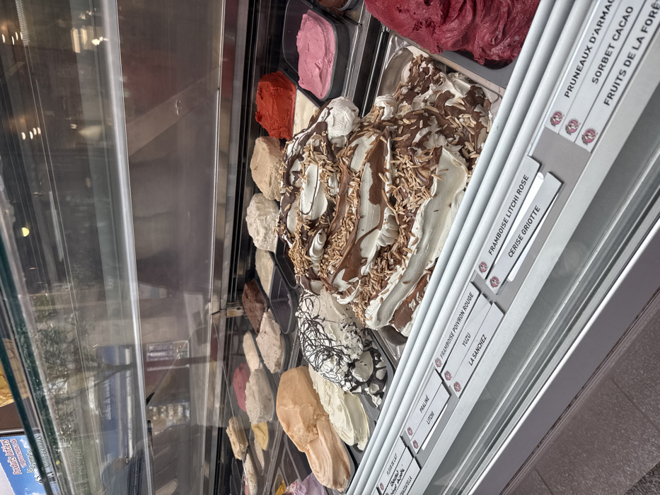 The image depicts a refrigerated display case filled with various flavors of gelato