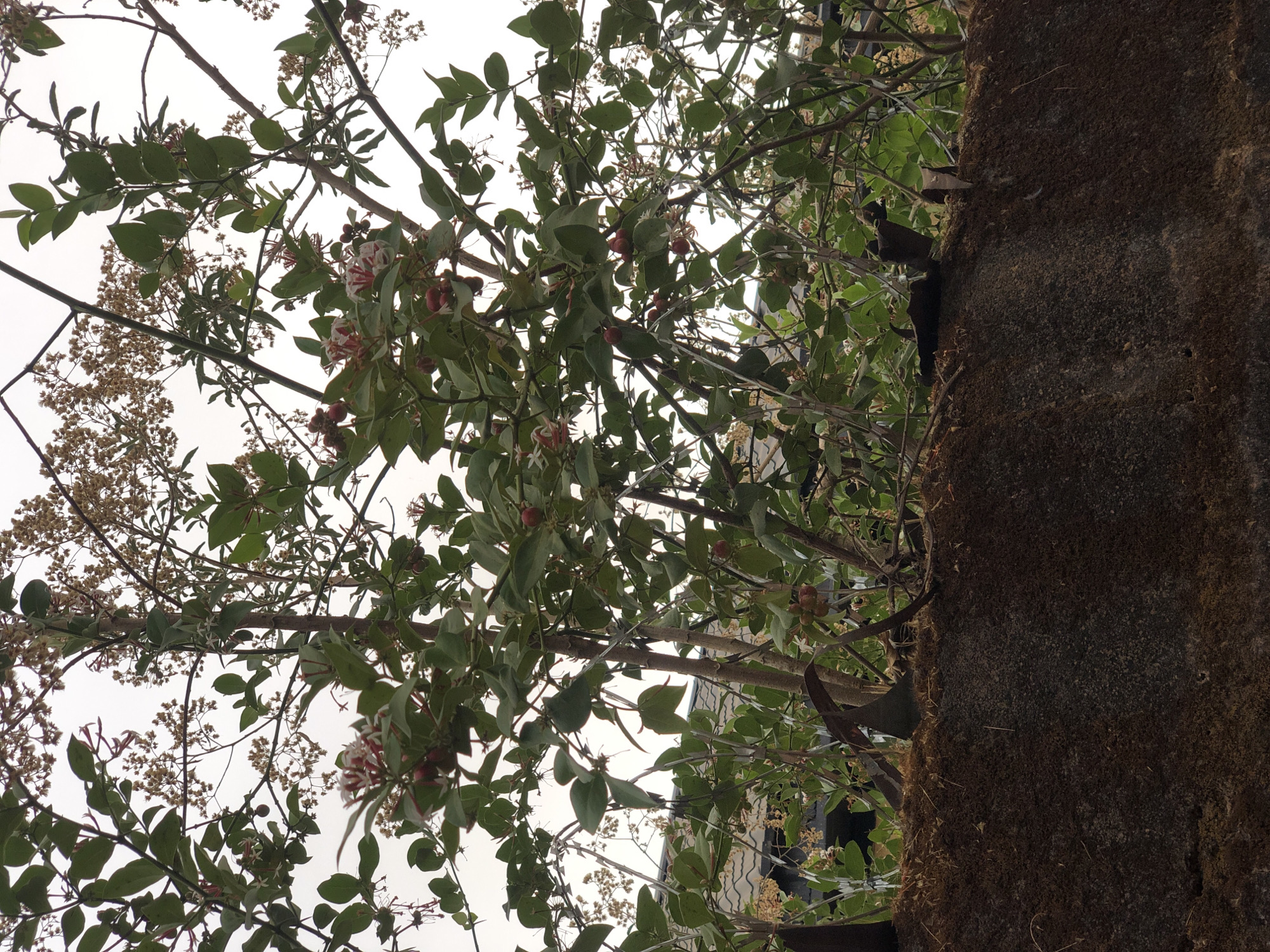 The image displays a dense cluster of vegetation and a textured wall in Gura Top, Nigeria, beneath an overcast sky. The lower third of the frame is occupied by a dark, rough-textured wall or barrier, likely concrete or mud, with a layer of dry, light brown organic material along its upper edge. Above and behind this wall, numerous plant branches are visible, bearing green leaves. Interspersed among the foliage are clusters of small, ovoid, reddish-pink fruits, along with several white flowers distinctly striped with red. Additionally, dried, light brown flower remnants or seed heads are present on other branches. A dark, corrugated roof structure is partially discernible behind the dense plant growth. No individuals or animals are present within the scene.