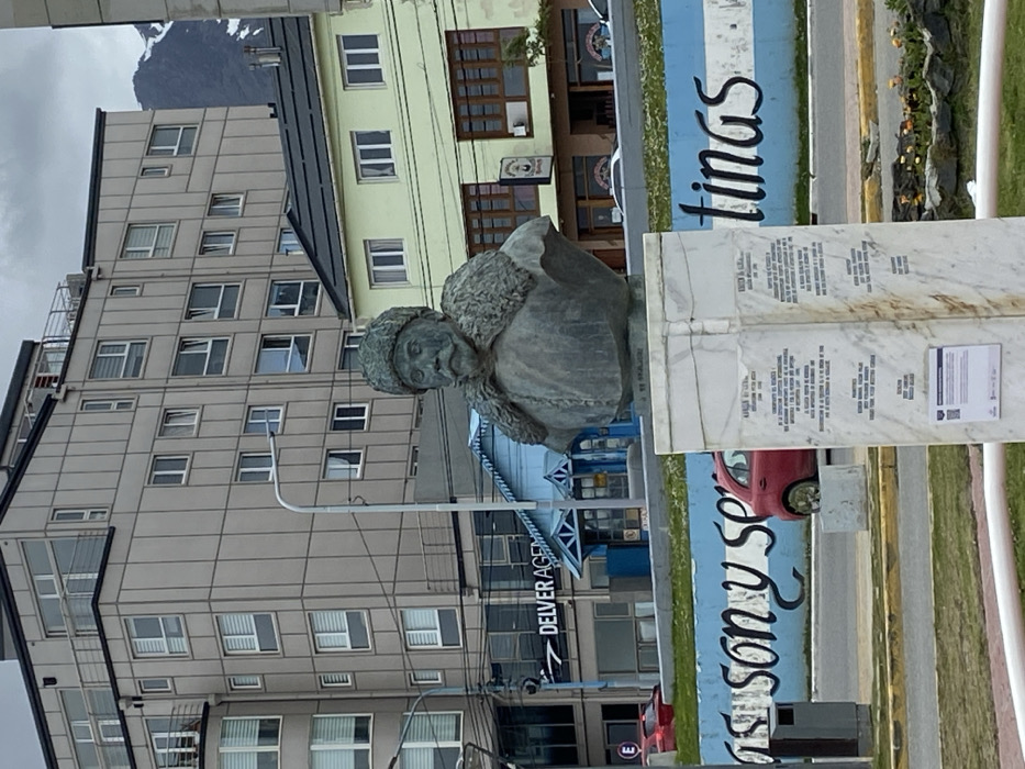 A bronze bust of a man wearing a hat and fur collar sits on a marble pedestal. The pedestal contains engraved text and a QR code. Behind the bust is a multi-story gray building with many windows, along with a yellow building. A sign reading "Estacion se son y se" is painted on a wall behind the pedestal, featuring light blue and white stripes. A red car is parked nearby. Mountains are visible in the distant background under a cloudy sky.