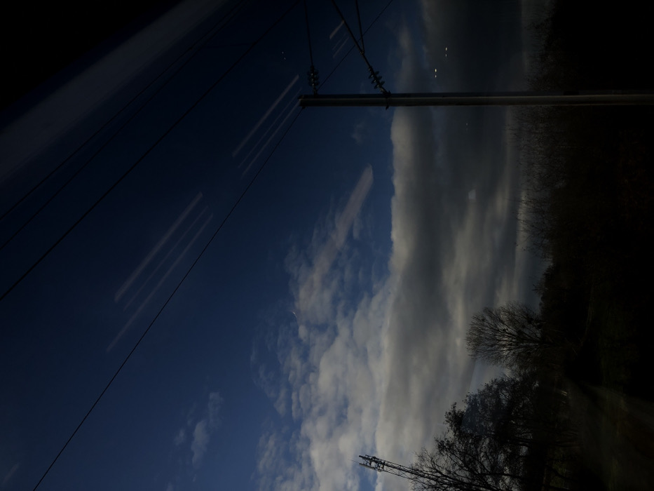 A dark, angled composition showcases a blue sky with scattered white clouds alongside a band of heavy, gray clouds. A power line pole and wires dominate the upper portion. A dark reflective surface is visible on the left side of the image. Bare trees and a cellular tower silhouette against the cloudy backdrop in the lower part of the view. The right side is obscured by a dark, indistinct area likely representing dense foliage.