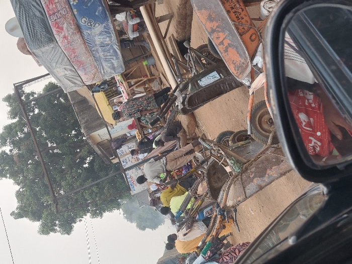 A bustling roadside market scene is captured from a vehicle's perspective. Mattresses are stacked high, while vendors sit or kneel on the ground, displaying fabrics and other wares. Rickshaws line the dusty edge of the road, hinting at transportation options. A rearview mirror provides a glimpse of the car's interior and the driver. Trees and buildings create a backdrop to this vibrant commercial activity.