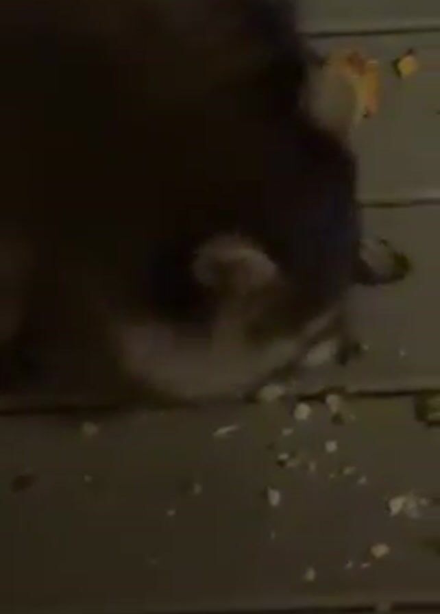 A raccoon is eating food off of a wooden deck. The raccoon is mostly gray with a black and white striped tail and a black mask around its eyes. It is standing on all fours and using its paws to pick up pieces of food. There are crumbs and larger pieces of food scattered on the deck around the raccoon. The lighting is dim, suggesting it is nighttime. Voices are audible in the background but are not clearly discernible.