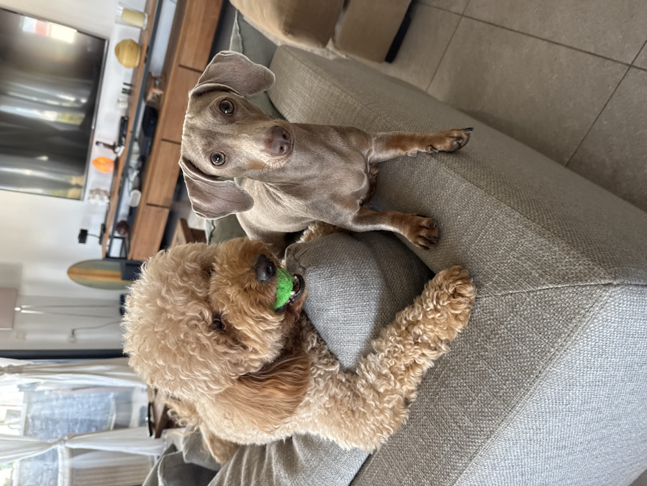 This image depicts two dogs resting on a light grey fabric sofa within a domestic living room located in Raanana, Israel. On the left, a light brown Poodle-type dog with curly fur is positioned on the sofa, holding a small, textured green ball in its mouth. Its head is turned towards the right, and its front paws rest on the sofa's arm. To its right, a smaller, sleek-coated, light brown Dachshund-type dog sits upright on the sofa, looking directly forward with wide, dark eyes. Its floppy ears are lowered. The background reveals a modern living room interior. A large flat-screen television is mounted above a wooden media console with dark metal accents. Various decorative objects are present on the console, including an orange salt lamp, a white sculptural item, and a light-colored pitcher. To the left of the console, a light-colored surfboard leans against the wall, and a tall floor lamp with a white shade is visible. Large windows with sheer curtains are present in the far left background, providing ambient light. The flooring appears to be light-colored tile. An additional sofa section or ottoman, matching the main sofa's upholstery, is partially visible on the far right.