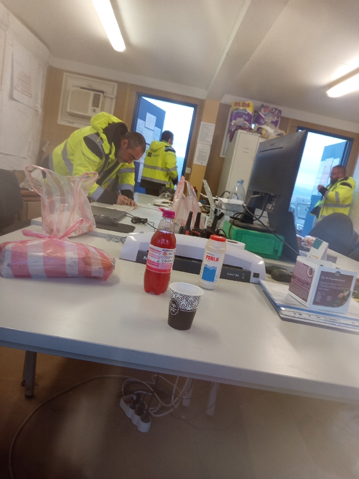 The image displays an indoor scene, identified as an office or break room located in Drugan, Bulgaria. Four adult males are present. All individuals are wearing high-visibility yellow and black work jackets. In the foreground, a male with short hair and a beard is leaning forward over a light-colored desk, his attention directed towards an object on the desk surface. On this desk, from left to right, are a rectangular item wrapped in red and white striped plastic, a clear crumpled plastic bag, a red plastic bottle containing a red liquid, a white plastic bottle labeled "PERLA" with blue lettering, and a dark-colored disposable coffee cup with a light patterned design. Further along the desk are a black electronic device (possibly a laptop), various black cables, a white office machine (possibly a laminator or scanner), a black computer monitor, a clear plastic water bottle, a stack of blue folders, and a small dark-colored cardboard box. In the mid-ground, a second male, facing away from the camera, stands near an open blue door, revealing a bright, overcast outdoor environment. A third male is partially visible to the left, also leaning over the same desk. A fourth male is visible in the background on the right, standing near a second open door, looking outward. The room features a white ceiling with exposed fluorescent tube lighting. The walls are predominantly light-colored, with some sections appearing to be wood-paneled. An air conditioning unit is mounted on the left wall. Papers are affixed to various wall surfaces. A white two-drawer filing cabinet is situated against the back wall, topped with several plastic bags containing items. Below the main desk, a white power strip with multiple outlets and tangled white cables is visible on the floor.