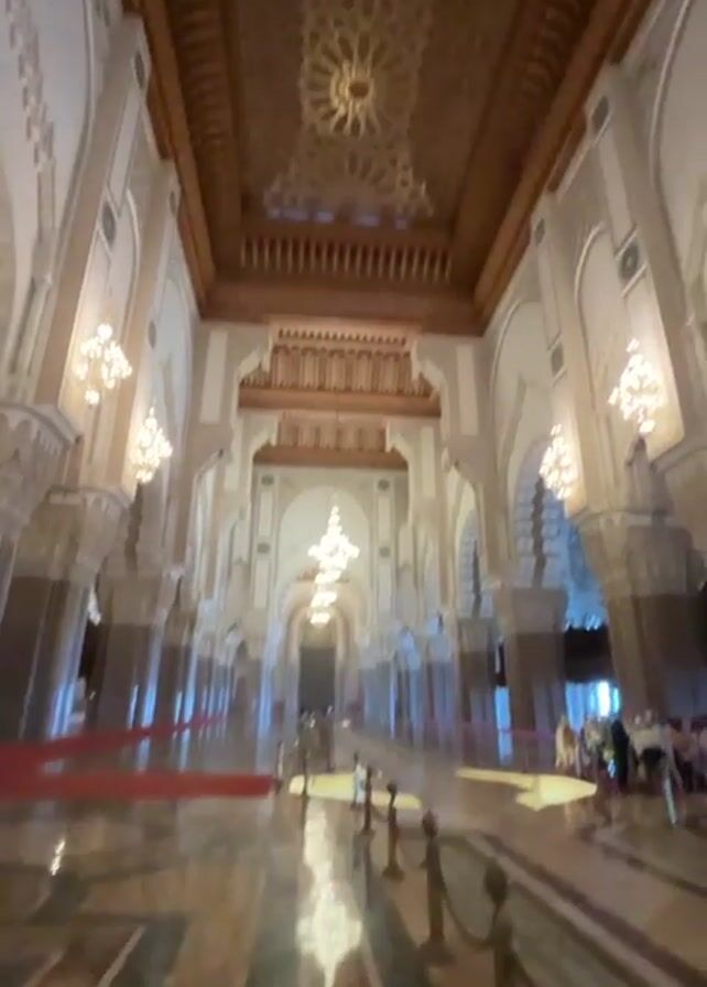 interior of a large hall with high, ornately decorated ceilings. There are large chandeliers hanging from the ceiling and tall columns on either side of the hall. The floor is made of a patterned stone. There are several people walking around and looking at the architecture. The video pans upwards to focus on the ceiling, showcasing the intricate wooden carvings.