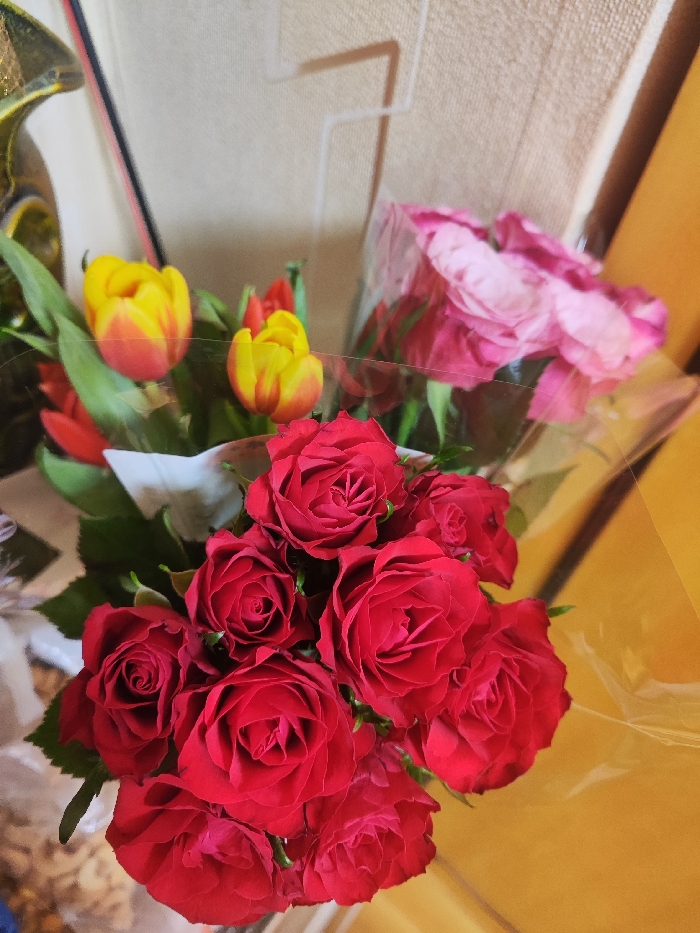 The image displays a close-up view of multiple bouquets of cut flowers, situated in Sliven, Bulgaria. In the foreground, a prominent bouquet features approximately ten to twelve vibrant red roses, fully bloomed, with green foliage visible. This bouquet is encased in clear plastic wrapping. To the left and slightly behind the red roses, a second bouquet contains at least two distinct yellow tulips exhibiting orange-red streaks, accompanied by smaller red flower buds, also wrapped in clear plastic. In the upper right quadrant, a partially visible, out-of-focus third bouquet of pink roses is present, similarly wrapped in clear plastic. The background consists of a light beige or off-white wall with a subtle textured pattern, displaying faint white geometric line artwork. A vertical light-colored surface, possibly a wall or door frame, is visible on the far right. No individuals are depicted, and no specific actions or interactions are observed.