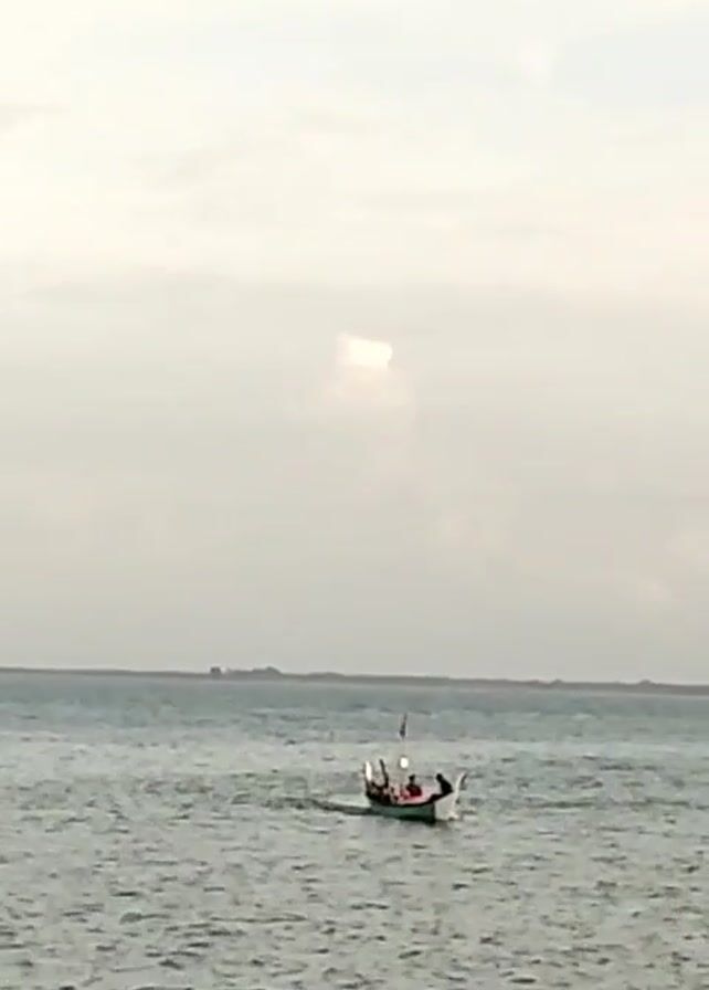 A small boat carrying several people travels across a body of water towards the camera. The boat appears to be a traditional design, with an elevated front and stern. The water is choppy, and the sky is overcast. In the distance, a low-lying landmass is visible.