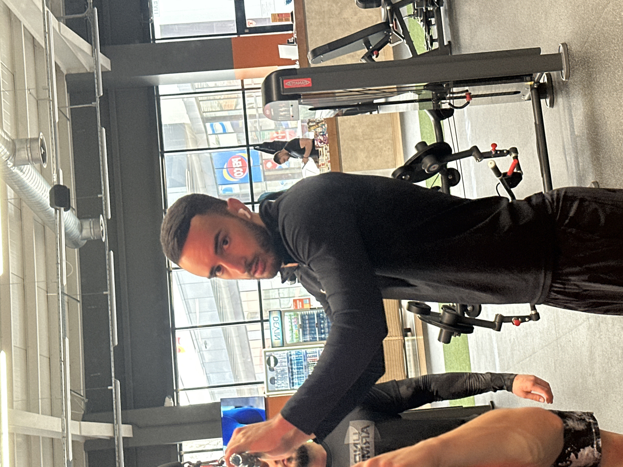 A man in a black long-sleeved shirt stands in a gym, looking at the camera. The gym has large windows offering a view of a street with buildings, including one with the logo "BEKO" visible. There are various gym equipment items around the man. Another person, lying on a bench, is visible in the lower part of the frame. The location is likely in Plovdiv, Bulgaria, based on the "BEKO" logo.
