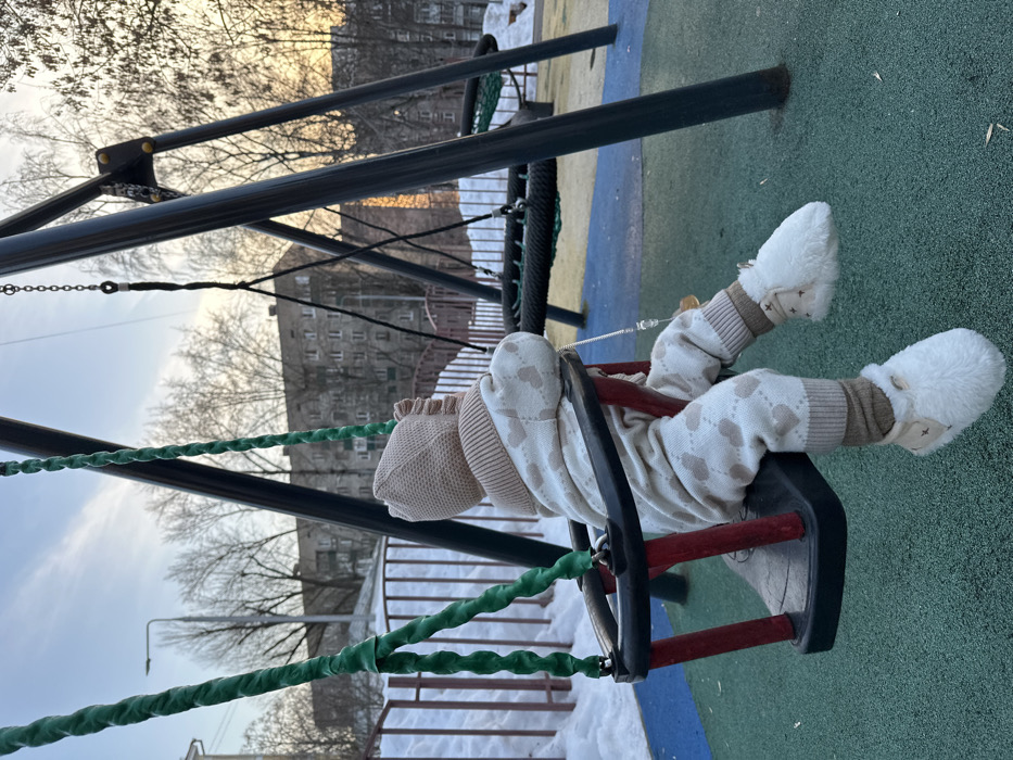 An infant is seated in a red and black toddler swing on an outdoor playground in Sadovaya, Russia. The infant is viewed from behind, facing away from the camera, and occupies the left side of the frame. The infant wears a light brown knitted bonnet with ruffled trim, a light beige one-piece outfit with a repeating pattern of light brown hearts and diamond shapes, brown ribbed leg warmers, and white furry booties adorned with small dark stars. A pacifier on a silver chain hangs from the infant's chest. The toddler swing features green twisted rope supports and is attached to a dark grey metal swing set. Another black net swing is visible further back on the same swing set structure. The ground beneath the swing set is a multi-colored soft playground surface, primarily blue and green. To the left and in the background, accumulated snow borders a white metal fence. Beyond the fence, a street light pole is visible. The distant background features several grey, multi-story apartment buildings and numerous bare deciduous trees. The sky is a pale blue with some wispy clouds. Low, warm sunlight illuminates a section of a distant building on the right, indicating late afternoon or early evening.