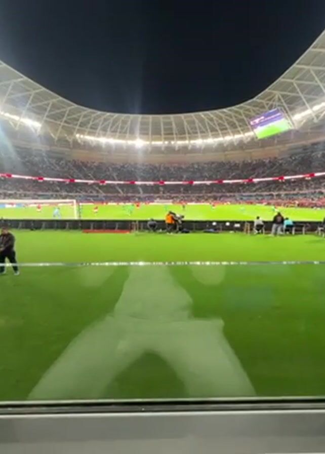 soccer game from behind glass. The view looks out onto a green soccer field with players in red and green uniforms. There are several other individuals near the side of the field, including a man standing by a white chair. The stadium is very large and full of people. Above the field, there are large screens displaying video. The lighting is bright, and the sky is dark. A figure is reflected in the glass in the foreground.
