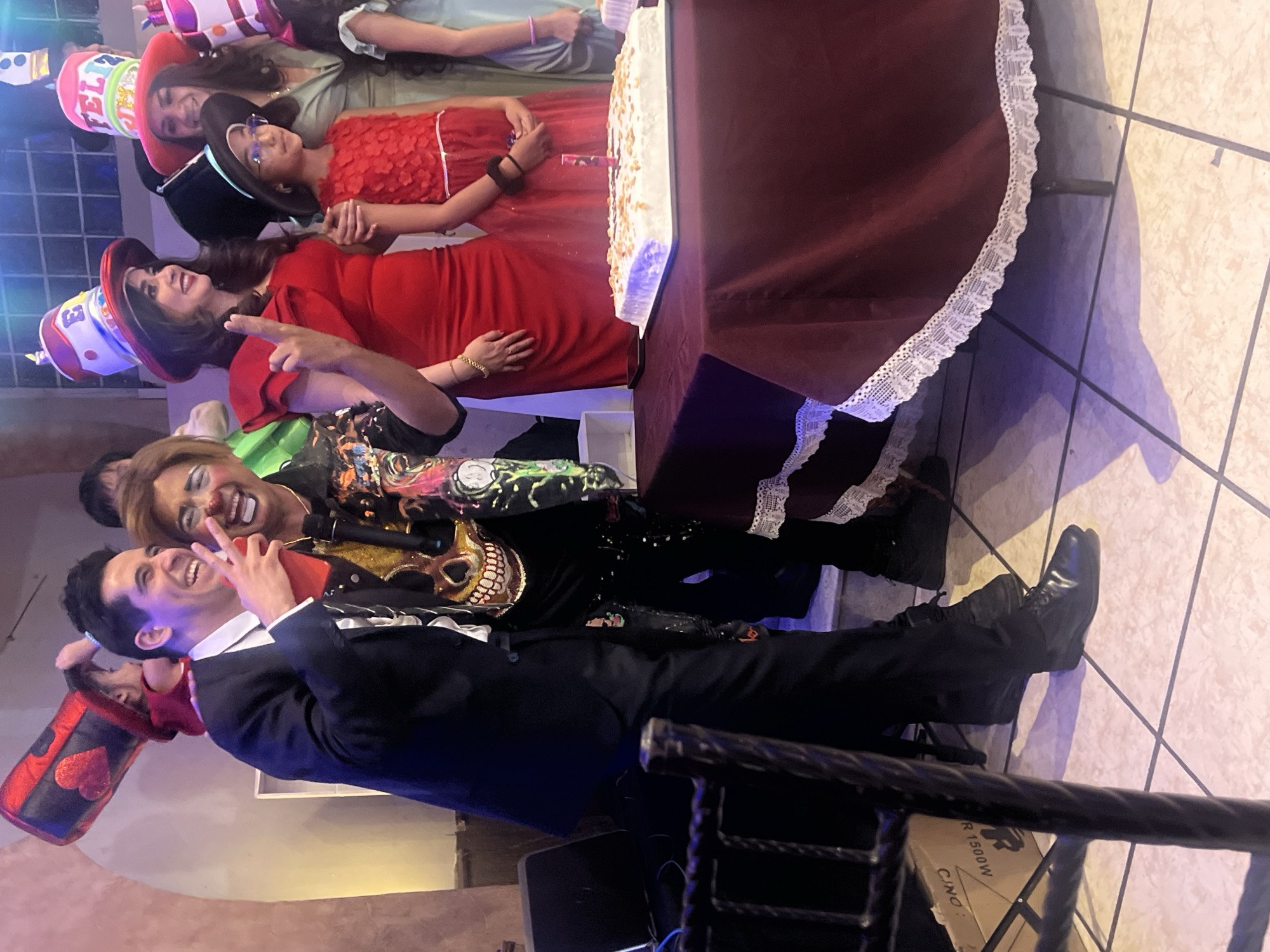 This image shows a group of people at what appears to be a birthday celebration in Puebla, Mexico
