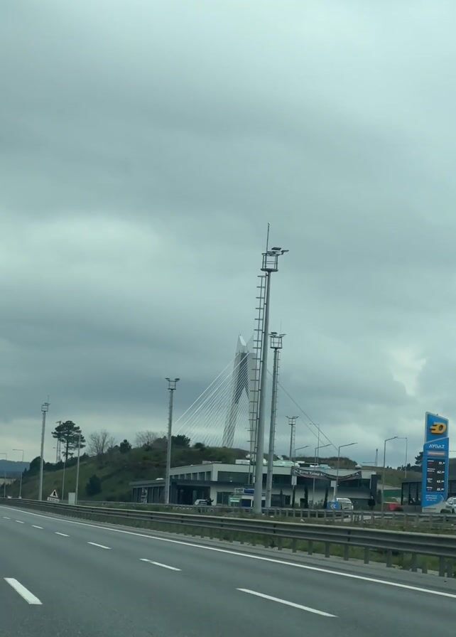 view from a car driving on a highway, approaching a rest stop. The sky is overcast with thick, grey clouds. On the right side of the highway, there's a hillside with a building at the top, identified by signage as Bursa Kebap Evi, a restaurant. A modern suspension bridge is visible in the background behind the restaurant. The highway has white lane markings and a metal guardrail on the side closest to the viewer. There are streetlights and tall antenna-like structures lining the highway. A gas station with the "AYGAZ" logo is also visible. Cars are parked near the gas station and restaurant. The camera is mostly still, with slight movements due to the car's motion.
