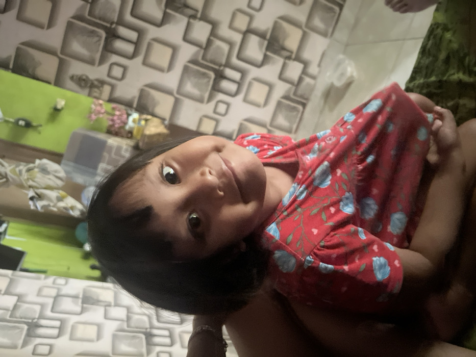 A young child with dark hair and brown eyes is lying down, facing the camera. She is wearing a red dress with blue floral patterns. The background includes a wall with a textured cube design, a glimpse of a green surface with objects, and a light-colored surface with a similar textured pattern. Part of a person's leg is visible in the upper right corner of the frame.