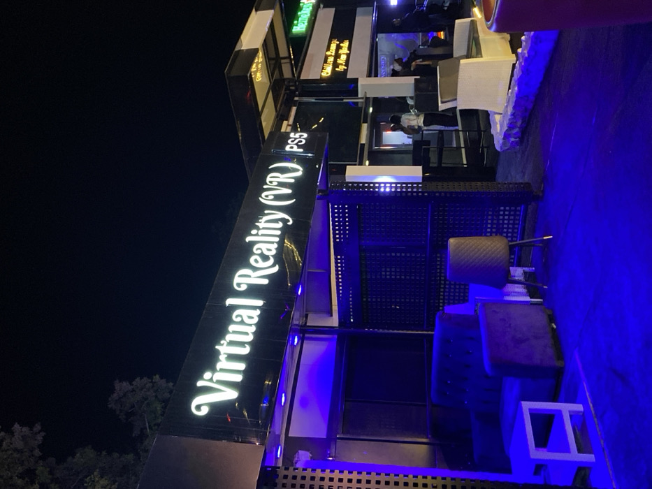 An outdoor virtual reality (VR) entertainment venue at night. Illuminated white letters spell out "Virtual Reality (VR) PS5". The architecture has a modern, minimalist design, featuring black and white structures. Seating and furniture with a dark, textured appearance is present, and blue lighting enhances the atmosphere. A Heineken sign is visible in the upper portion of the frame, next to the sign that reads "Chillest Lounge by New Yorker". People are present inside the venue.