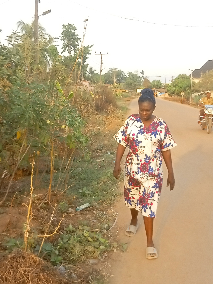 An outdoor scene in Igbenu, Nigeria, depicts a woman walking on a paved road