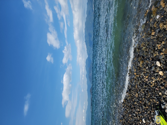 The image displays a coastal scene in Vĩnh Lương, Vietnam. The foreground consists of a rocky beach composed of dark-toned, wet pebbles and stones. Small waves are observed breaking at the water's edge. In the lower-left corner, a yellow snorkel mask, a black snorkel, and a green swim fin are resting on the rocks. The midground features a large body of water with visible ripples and varying shades of blue and green. The background reveals a distant range of mountains or hills extending horizontally under a clear blue sky sparsely dotted with white cumulus clouds. A small island or landmass is visible within the body of water to the left of the mountain range. No human figures or specific actions are depicted.