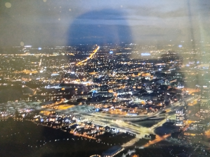 A nighttime aerial view of a sprawling city reveals a dense network of illuminated buildings and roads. Bright lights speckle the landscape, creating a vibrant scene. A prominent highway stretches through the center of the frame. The sky above is dark, with a few scattered clouds. A large, blurry reflection is visible on the upper right.
