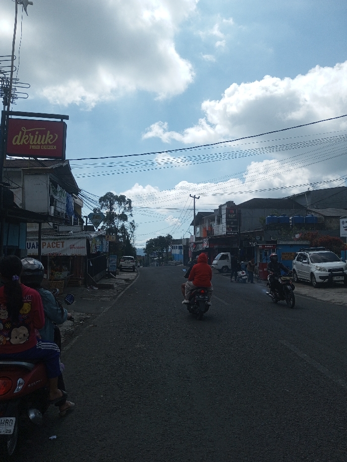 A street scene in the city of Naung Bo Oe, Myanmar, features a paved asphalt road beneath a sky with scattered white clouds