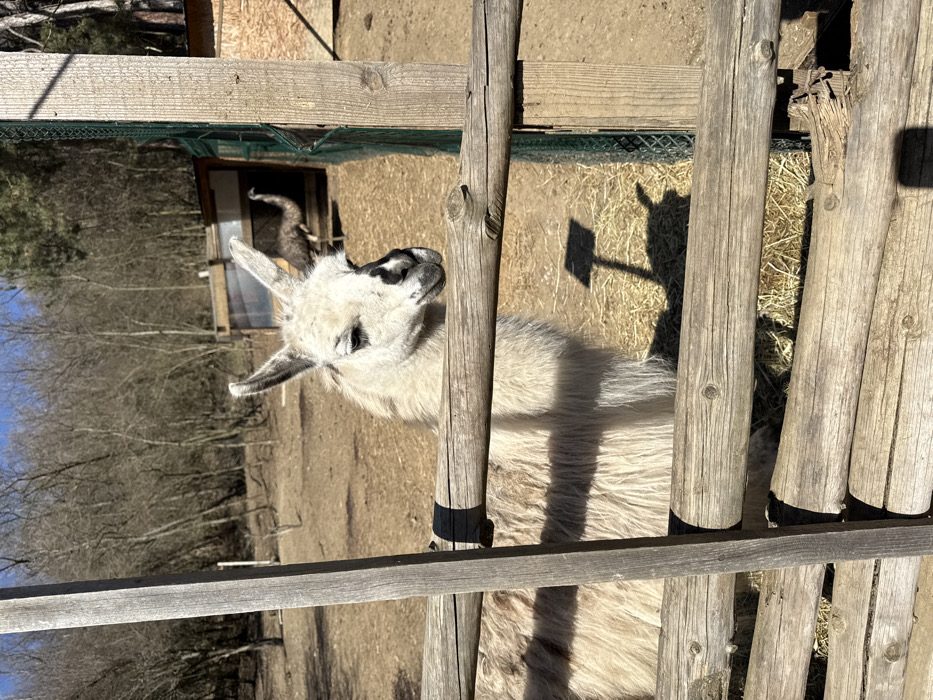 The image displays an animal enclosure in Leskovets, Bulgaria, under clear, bright skies. A white-furred llama, exhibiting dark markings around its muzzle, stands in the mid-ground, positioned directly behind a three-tiered wooden log fence. Its head is turned slightly to the right. In the background, a brown emu stands on the dry ground near a small, light-colored wooden shed featuring a translucent corrugated roof panel. A green net barrier is visible to the right, partially obscuring the view of the shed. The ground within the enclosure consists of dry earth with scattered patches of hay. A distinct shadow, resembling a small signpost or feeder, is cast onto the ground in the foreground. Bare trees, indicative of a dormant forest or woodland, form the distant background.