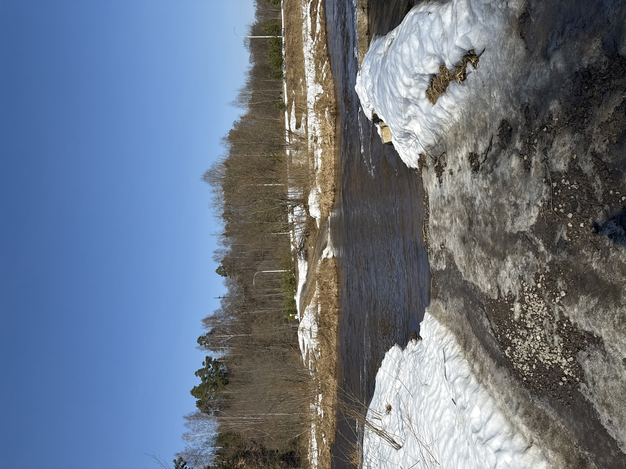 The image captures a late winter or early spring landscape in Demino, Russia. A wide, brown, turbulent river or stream dominates the central and lower portions of the frame, flowing from the foreground towards the middle ground. In the immediate foreground, a path of dark, damp soil, mud, and scattered light-colored gravel descends into the water. This path is flanked by significant banks of melting snow and ice, showing slush and exposed earth. On the right foreground, a snow-covered structure, possibly a concrete support or part of a small weir, extends into the river. Mid-stream, a narrow landmass covered in dry, matted, light-brown vegetation divides the water flow. Beyond this, on the far bank, a dirt track ascends through patches of melting snow and dry grass. A small, rectangular yellow sign on a pole is visible near this path. Further to the right, a tall, light-colored street lamp with a single arm stands near a cluster of small evergreen trees. Beyond the lamp and trees, a line of light-colored vehicles is parked along what appears to be a raised road or embankment. The background features a dense forest line composed of predominantly bare deciduous trees (including birches) mixed with dark green evergreen conifers. The sky above is clear, bright blue, and cloudless. No individuals are present in the scene.