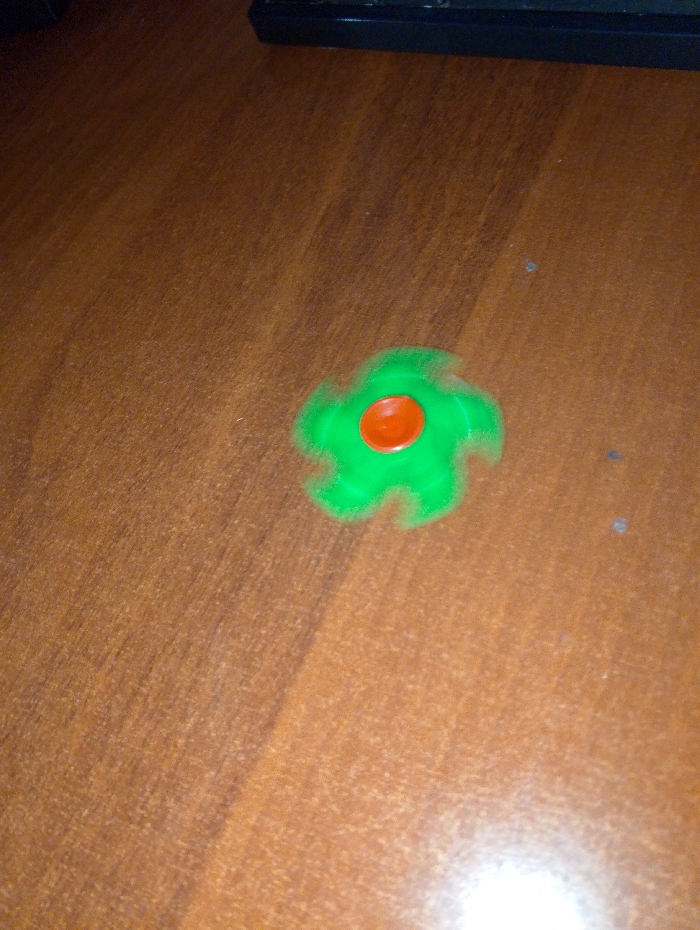 - "A green fidget spinner with an orange center is spinning rapidly on a wooden surface" by FM-W2D6p2, licensed under CC BY 4.0