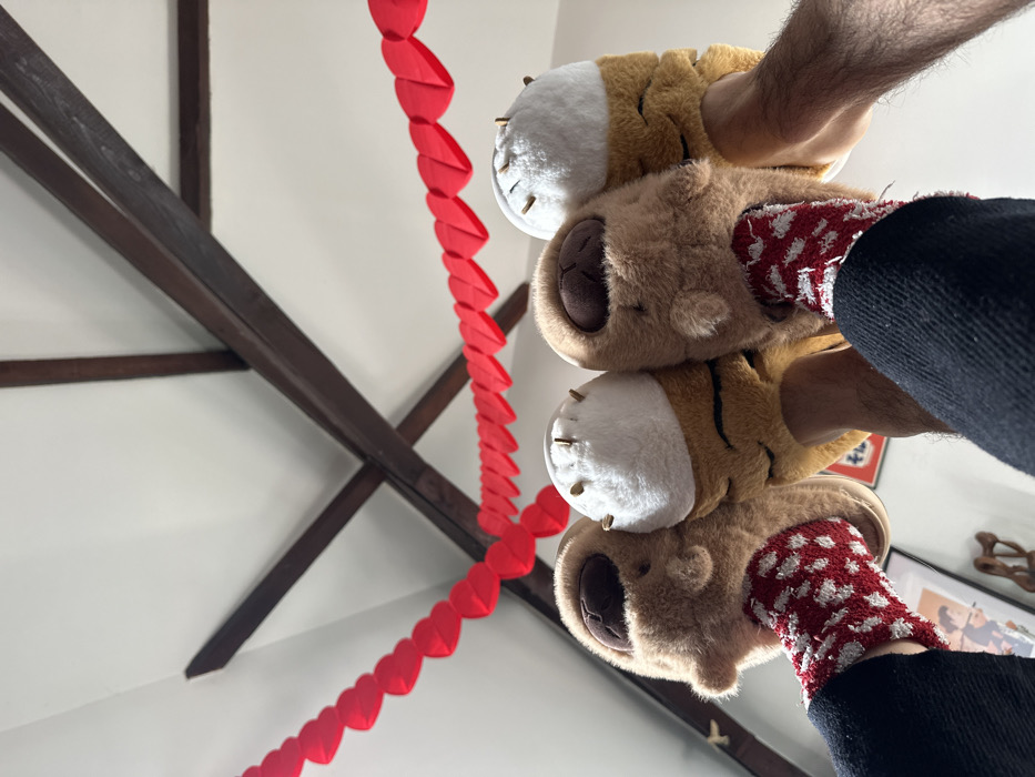 - "An upward-angled photograph captured indoors in Carnin, France, displays four feet adorned with plush slippers, positioned together against a backdrop of a white ceiling and dark wooden beams" by FM-sKHBD2, licensed under CC BY 4.0