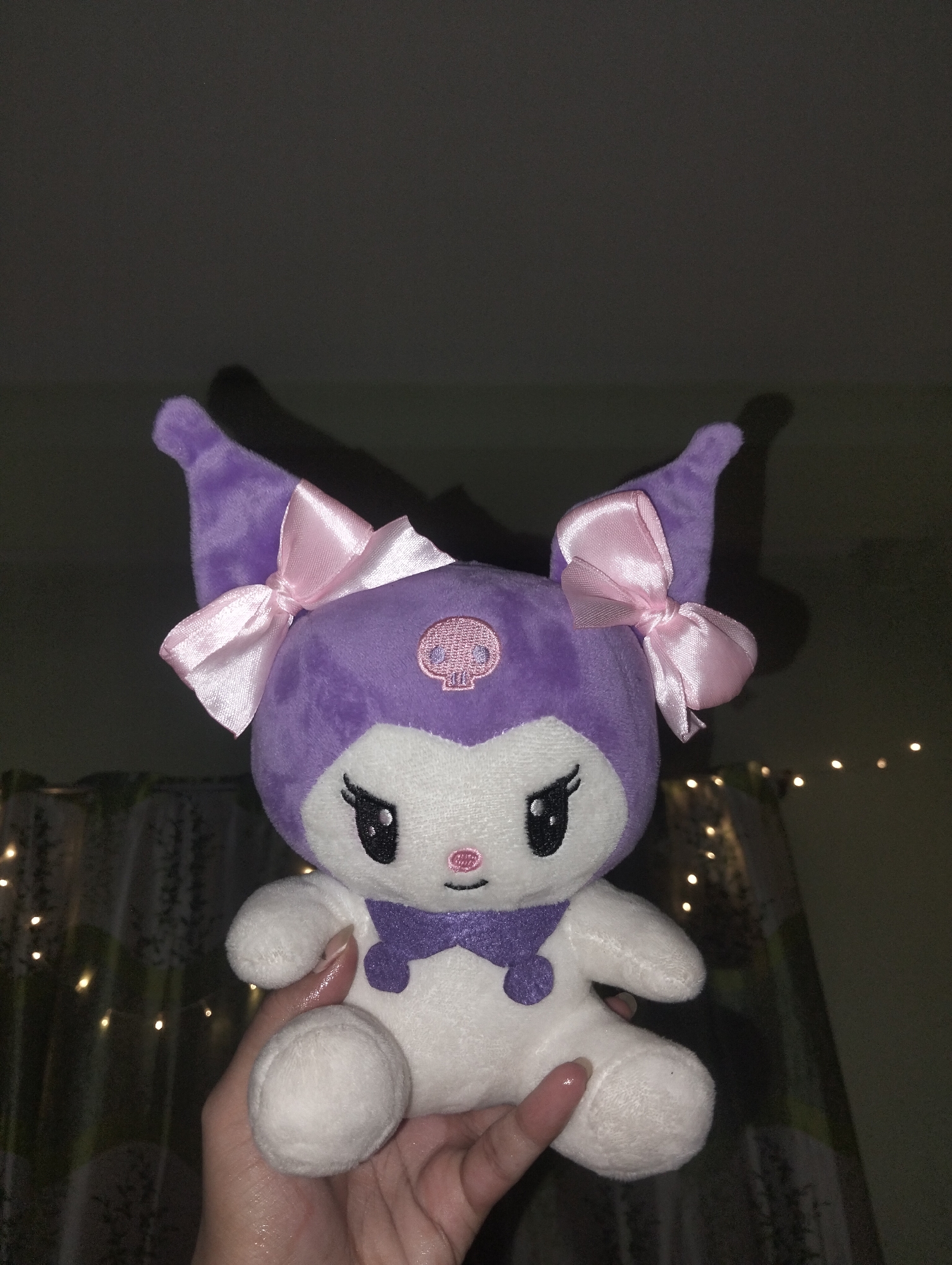 A plush toy is held vertically by a human hand in an interior setting in Dhaka, Bangladesh. The toy is approximately 15-20 cm in height, depicting a character with a purple head and ears, a white face, and a white body. Two light pink satin bows are affixed to the top of the purple ears. A light pink skull emblem is embroidered on the center of the purple forehead. The toy features black, oval-shaped eyes, a small pink triangular nose, and a small purple bow on its chest. The visible human hand has a light-to-medium skin tone, with fingernails appearing manicured and coated with a light, possibly clear or pale pink, polish. The background is dark and out of focus, with a string of small, illuminated warm-toned lights visible horizontally across the right side. A faint, dark, possibly textured or patterned surface is partially discernible behind the lights. Lighting is dim, indicating low ambient light conditions.