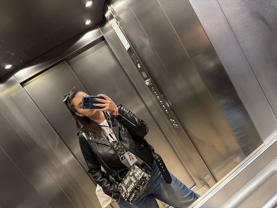 A female individual is captured in a mirror selfie taken inside a modern elevator