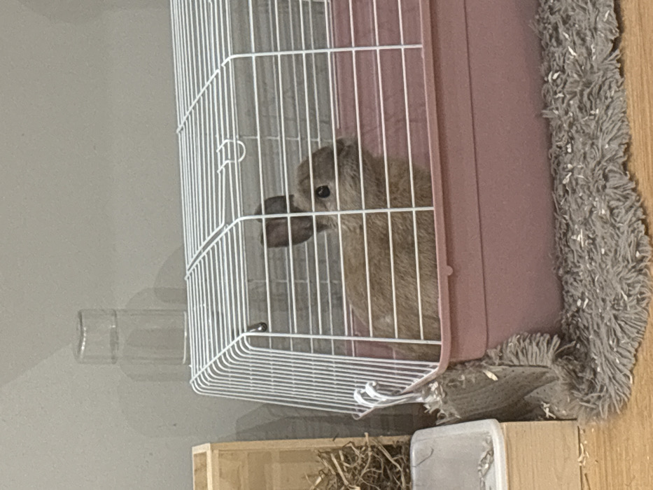 - "The image displays a light brown domestic rabbit contained within a pink-based cage with a white wire top" by FM-W0JCt1, licensed under CC BY 4.0