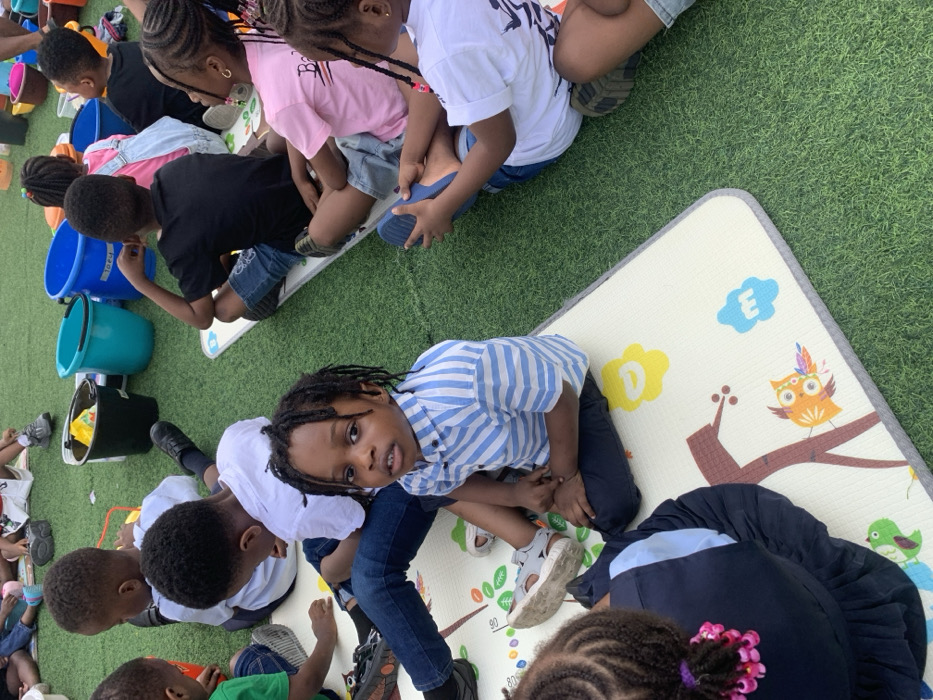 - "The scene depicts a group of approximately ten young Black children, likely preschoolers, seated outdoors on artificial green turf and patterned foam playmats in Lekki, Nigeria" by FM-Ai1vM2, licensed under CC BY 4.0