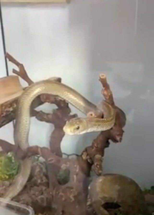 A snake in a glass enclosure is observed