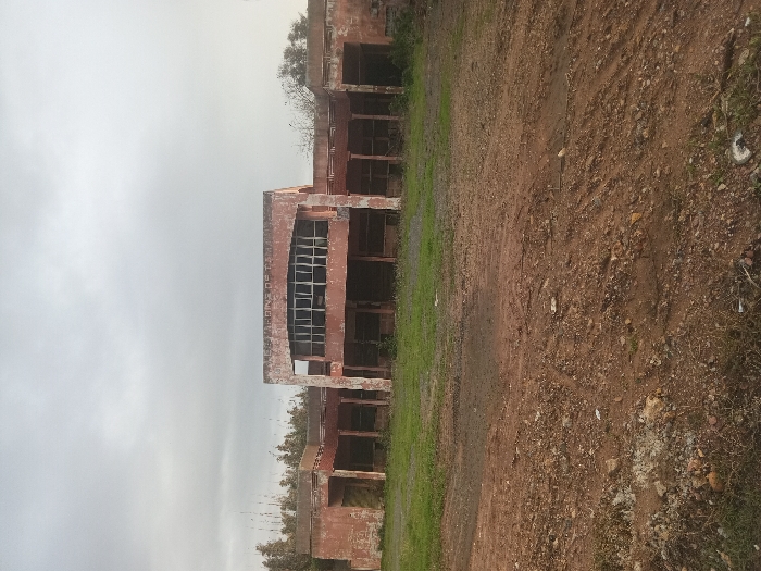 A deteriorating three-story building with large window openings stands amidst overgrown vegetation. The facade shows signs of aging and wear, with weathered paint and visible structural damage. A dirt road or path runs alongside the building, contrasting with the gray, overcast sky. The scene evokes a sense of abandonment and decay.