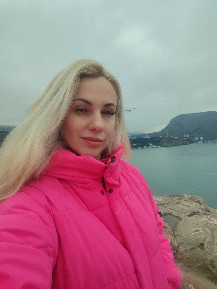 An adult female is depicted in a selfie, positioned on a rocky promontory overlooking a body of water identified as being in Utios, Ukraine. The woman has long blonde hair, light skin, and is wearing a bright fuchsia, padded winter jacket with a high collar secured by dark buttons. She looks directly into the camera with a neutral expression. In the background, a large expanse of greenish-blue water extends towards a distant coastline. This coastline features a prominent dark hill or mountain on the right, with several lighter-colored buildings visible along the shore. The sky is uniformly overcast and grey. A single white bird is in flight in the mid-ground, to the right of the woman's head. The immediate foreground consists of rugged, light-colored rocky terrain, with a small puddle of water visible in a depression to the right. The scene suggests a cool, cloudy outdoor environment.