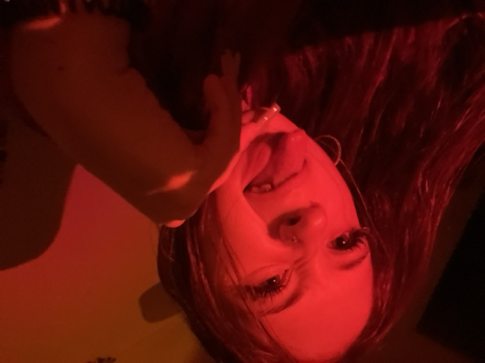 A close-up, low-angle indoor photograph depicts a single individual, appearing female, illuminated by strong, monochromatic red lighting. The subject's face is prominent, positioned slightly off-center and angled towards the camera. Long, dark hair is visible on the left side of the frame. The individual's left eye (viewer's left) is clearly visible with elongated eyelashes; the right eye is partially obscured by shadow. The mouth is open, with the tongue extended. A hoop earring is present on the left ear. A hand, likely the subject's right, is positioned on the lower right side of the frame, partially obscuring the lower face/neck area. The background is an indistinct wall or surface, also bathed in red light, with a shadow of the subject's head visible behind. The scene is located in Raanana, Israel.