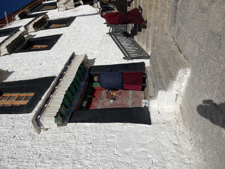 The image displays an outdoor scene at a white, multi-story building with textured walls in Chengguan District, China, under direct sunlight. In the central foreground, a person wearing a dark blue puffer jacket over a long, dark red monastic-style robe stands on a stone step, facing a large red wooden door. The door is adorned with dark metal decorative straps and a prominent circular metal knocker. Above the door, a colorful canopy features green, blue, and white decorative elements. To the right, another individual, also in a dark red monastic-style robe, is depicted descending a set of stone stairs, which are bordered by a black metal handrail with decorative balusters. Further up these stairs, the lower legs and backs of two additional individuals are visible ascending, one with a light-colored backpack. The building's white facade features several black-framed windows with orange-brown sills/frames, some equipped with decorative awnings. A distinct shadow of a person holding a smartphone is cast onto the paved stone ground in the lower left foreground.
