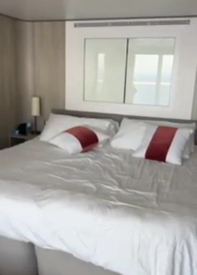 A woman is seen doing a front flip onto a bed. The room appears to be a hotel or cruise ship room with a large bed centered in the shot. The woman is wearing a bright orange athletic top and a black thong. She has brown hair pulled back into a braid. She performs the flip and lands with a slight giggle on the bed.