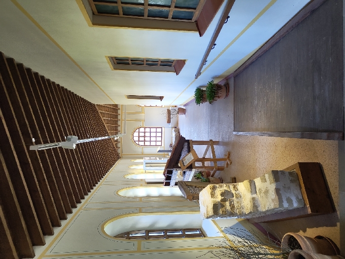 This image depicts the interior of a historical exhibition or museum located in Perl, Germany. The scene is a long, high-ceilinged corridor or hall illuminated by natural light entering through multiple windows. The ceiling features exposed dark wooden beams with lighter panels between them, along with a modern track lighting system running centrally. The walls are light-colored (off-white) and adorned with yellow decorative trim outlining window arches and bordering the ceiling and floor lines. On the left side of the corridor, several deeply recessed arched windows with light wooden frames are visible. Towards the far end, a prominent round-arched window with a grid of dark wooden panes allows more light into the space. The right wall features a series of rectangular windows with darker wooden frames and a simple wooden handrail running horizontally beneath them. The floor in the foreground consists of a dark, planked ramp-like section on the right, transitioning into a light-colored, textured floor, possibly concrete or large tiles, extending down the corridor. Numerous objects are displayed along the corridor: - In the foreground on the left, two terracotta pots, one containing a dry, sparse plant, are visible. - Further down the left side, a large, irregular block of light-colored masonry, possibly archaeological in origin, rests on a dark wooden display base. - Several wooden display stands are positioned along the main path of the corridor, with at least one holding a tilted informational panel. - Along the base of the right wall, beneath the rectangular windows, multiple terracotta pots containing green potted plants are arranged. No people are present, and no actions or interactions are depicted in the scene.