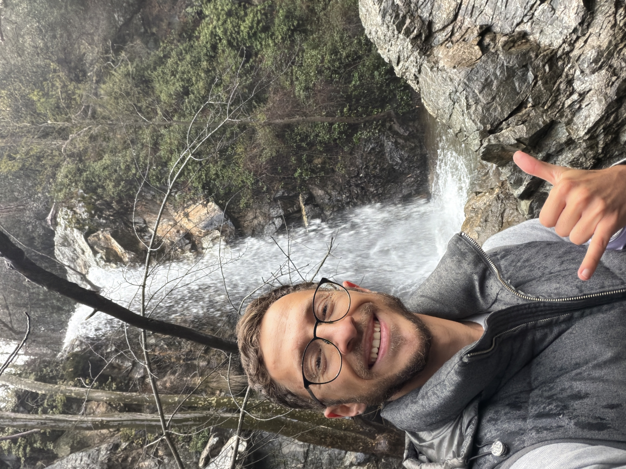 A man is posing for a selfie in front of the Milomeris waterfall in Pano Platres, Cyprus. He is wearing glasses and a grey zip-up vest, and he is giving a thumbs-up. The waterfall is in the background, surrounded by trees and rocks. The photo is taken in portrait format.