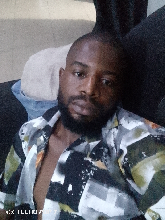 A bearded man with dark skin sits casually in a chair, wearing a patterned shirt. The shirt's design includes black, white, and tan colors. He looks directly at the camera with a relaxed expression. In the background, a white object rests on the chair, possibly a pillow or another cushion. The lighting appears to be indoor, casting soft shadows. "Tecno P7" is visible at the bottom left corner, likely indicating the device used to capture the image.