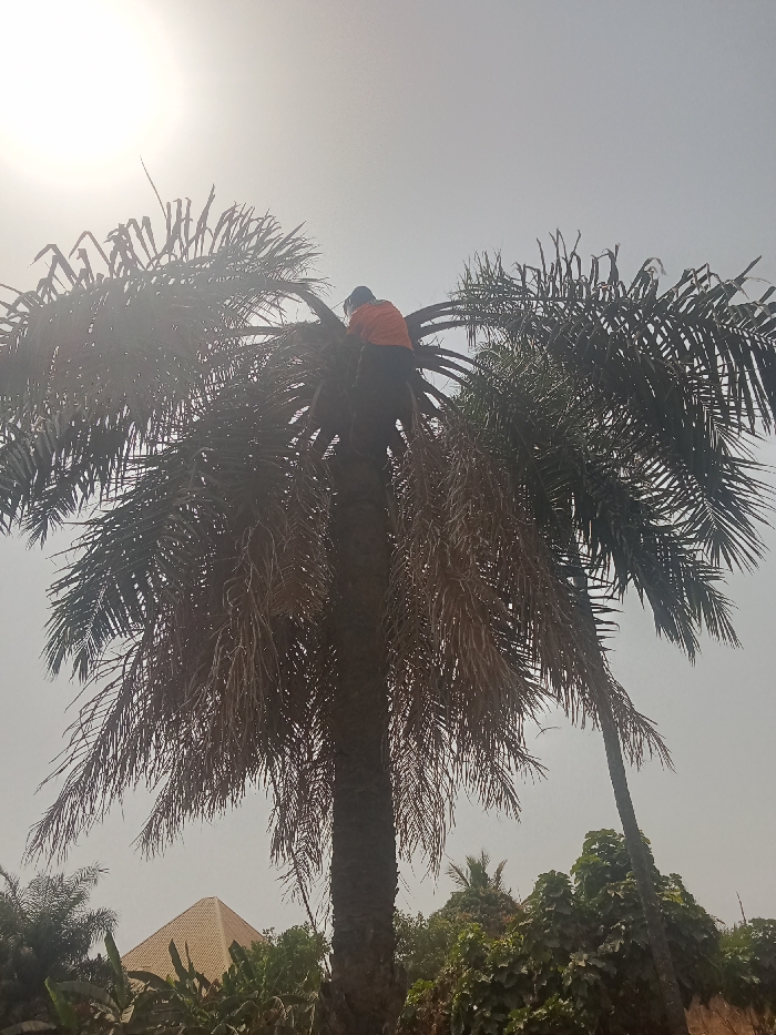The image presents an outdoor scene located in Akwanga, Nigeria. A single individual is positioned within the upper crown of a tall, mature palm tree, observed from a low angle. The person wears an orange top and dark trousers, with their back partially visible, indicating an action of being perched or engaged in work within the fronds. The palm tree features a robust trunk and numerous fronds, many of which appear brown and desiccated, hanging downwards. The sky is bright and overcast or hazy, with the sun's glare originating from the upper left quadrant. In the background, to the left, a light-colored building with a distinctive pyramidal roof is partially visible amidst dense green foliage. Additional green vegetation and another slender palm tree are present towards the right side of the frame.