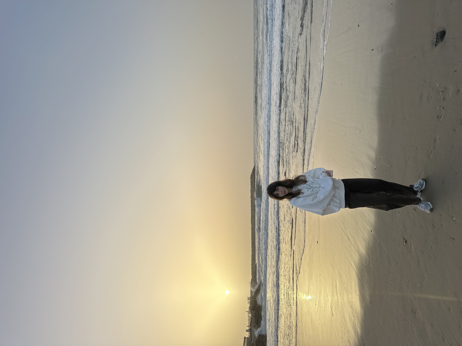 A young woman stands on a beach during sunset. She wears a white sweatshirt, dark pants, and sneakers. The sun is setting over the ocean, casting a golden glow on the sand and water. Gentle waves lap at the shore. The sky transitions from a pale yellow near the horizon to a soft gray above. The woman faces the camera, and the scene exudes tranquility and warmth.