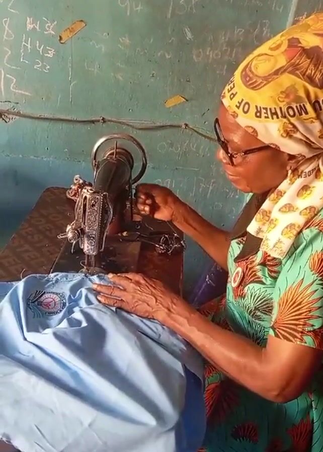 An elderly woman with glasses and a headscarf sews a light-blue garment with a black, vintage sewing machine