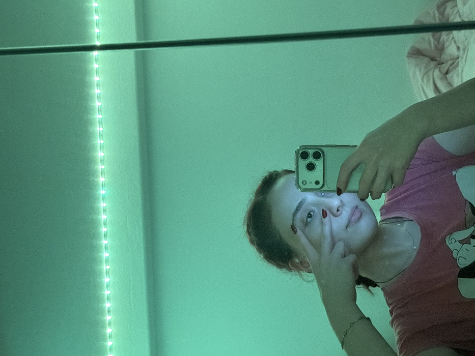 A selfie captures a young woman reflected in a mirror, illuminated by an eerie green light emanating from a strip of LEDs