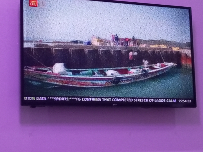 A flat-panel television, likely an LG model, is mounted on a uniform light purple wall within an interior space in Abuja, Nigeria. The television screen displays a news broadcast with a visually noisy, pixelated image. The content on the screen depicts a waterfront scene under an overcast or hazy sky. A long, narrow wooden boat, painted with red, white, and green stripes and bearing the word "PISA" in white lettering on its side, is partially submerged in the water. A black tire fender is visible on the boat's starboard side. White sacks or bundles are visible within the boat. Approximately 5-7 individuals are visible on a dark, concrete or stone pier/dock structure adjacent to the boat. One person in a red shirt is distinct among them. These individuals appear to be actively engaged near the water's edge, possibly handling cargo or interacting with the boat. Another person is visible in the water, close to the boat. In the upper left corner of the television screen, the red and white "ail" logo, characteristic of Africa Independent Television (AIT), is visible. A news ticker scrolls horizontally across the bottom of the screen, displaying fragmented text that includes "ATION DATA ***SPORTS***FG CONFIRMS THAT COMPLETED STRETCH OF LAGOS-CALABAR". A timestamp "15:54:38" is visible in the bottom right corner of the screen.