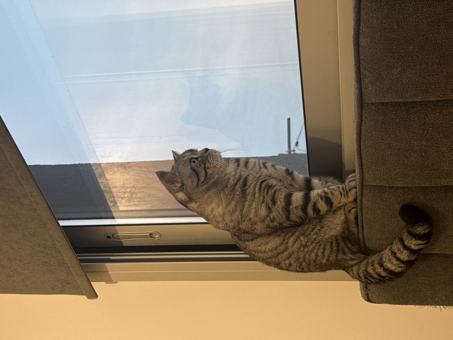 An indoor scene in Latsia, Cyprus, depicts a domestic tabby cat, predominantly grey with distinct dark stripes, seated upright on a grey upholstered furniture surface. The cat faces right, looking intently out a window. Its tail, striped and ending in a dark tip, hangs down the side of the furniture. The window features a light-colored frame and a partially lowered grey roller blind at the top. The glass pane reflects a silhouette of the cat and ambient indoor light, along with faint outdoor details that include horizontal lines against a bright sky. A plain, light-colored wall is visible to the left of the window. The overall lighting suggests a combination of natural daylight entering through the window and interior artificial light.
