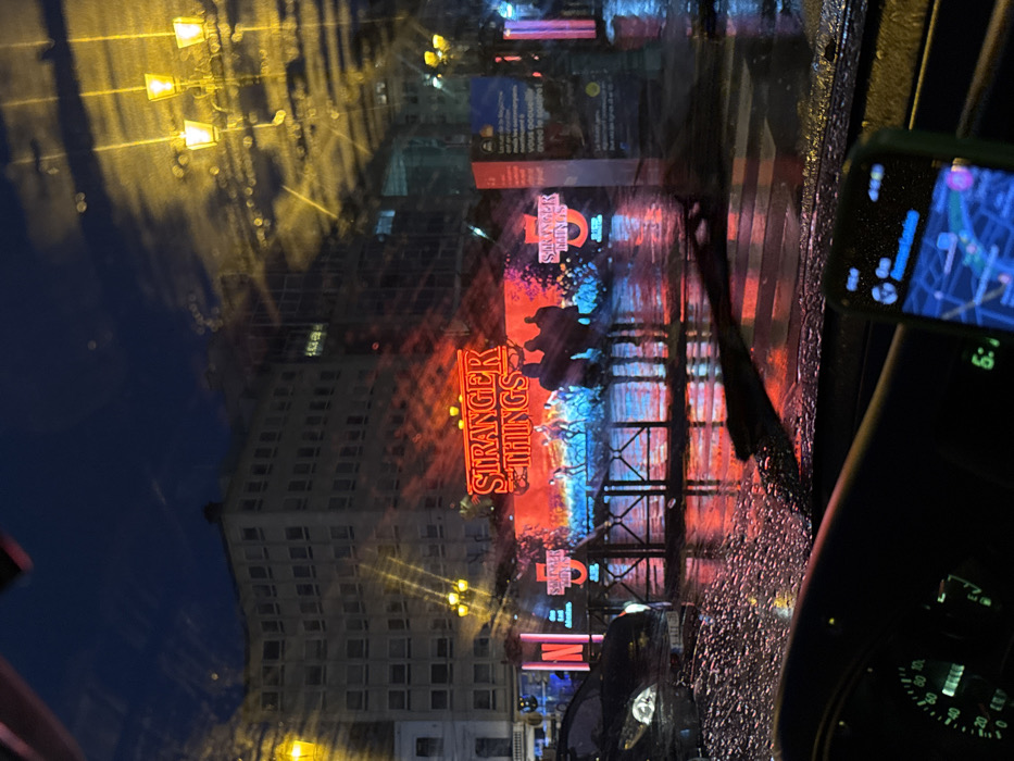 rainy night scene from inside a car. A large "Stranger Things" promotional display is visible across the street. The display features the show's logo in neon lights and imagery. Streetlights and a tall building can be seen in the background. The windshield has raindrops on it, and a GPS device is mounted on the dashboard, partially obscuring the view.