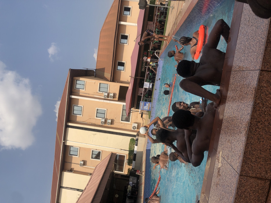 A group of young people is swimming and playing in a pool. Some are at the edge, while others are in the water. One person is holding a white ball. An orange inflatable ring is visible in the background. A multi-story building with a bar or restaurant area sits beside the pool. The sky is partly cloudy.