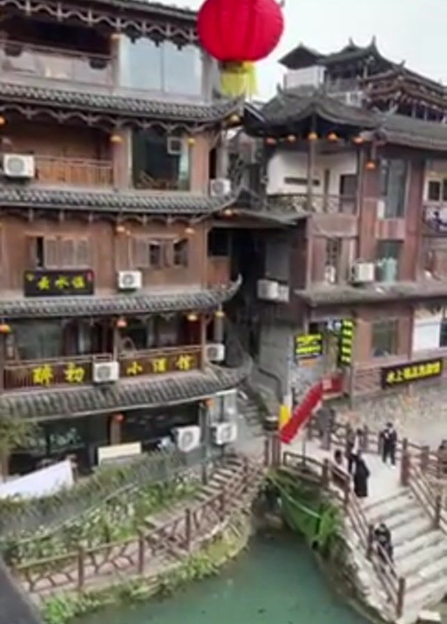 The video showcases a picturesque scene in a Chinese town, with traditional wooden buildings lining both sides of a narrow, green-tinted river. The buildings are multi-storied and feature balconies, with red lanterns hanging overhead, adding to the vibrant ambiance. A stone bridge with steps allows people to cross the river, and pedestrians can be seen walking across it. The scene appears to be a popular tourist destination. The weather seems overcast. Water is being sprayed into the river from a source out of frame.