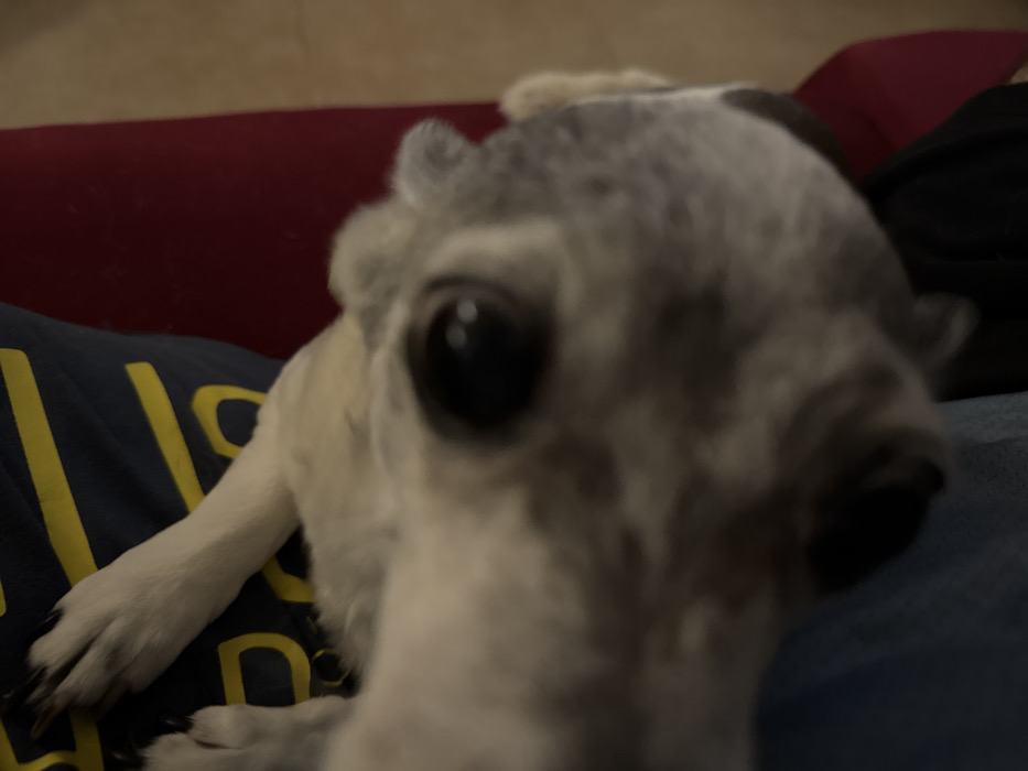A close-up, slightly blurry photo shows a white and grey spotted whippet dog looking directly into the camera. The dog's eyes are large and black, dominating the frame. Part of a blue t-shirt with yellow lettering is visible in the left corner, along with one of the dog's paws. A red couch cushion is in the background, partially obscured by a black object. The dog's head is the main focus, positioned in the center.